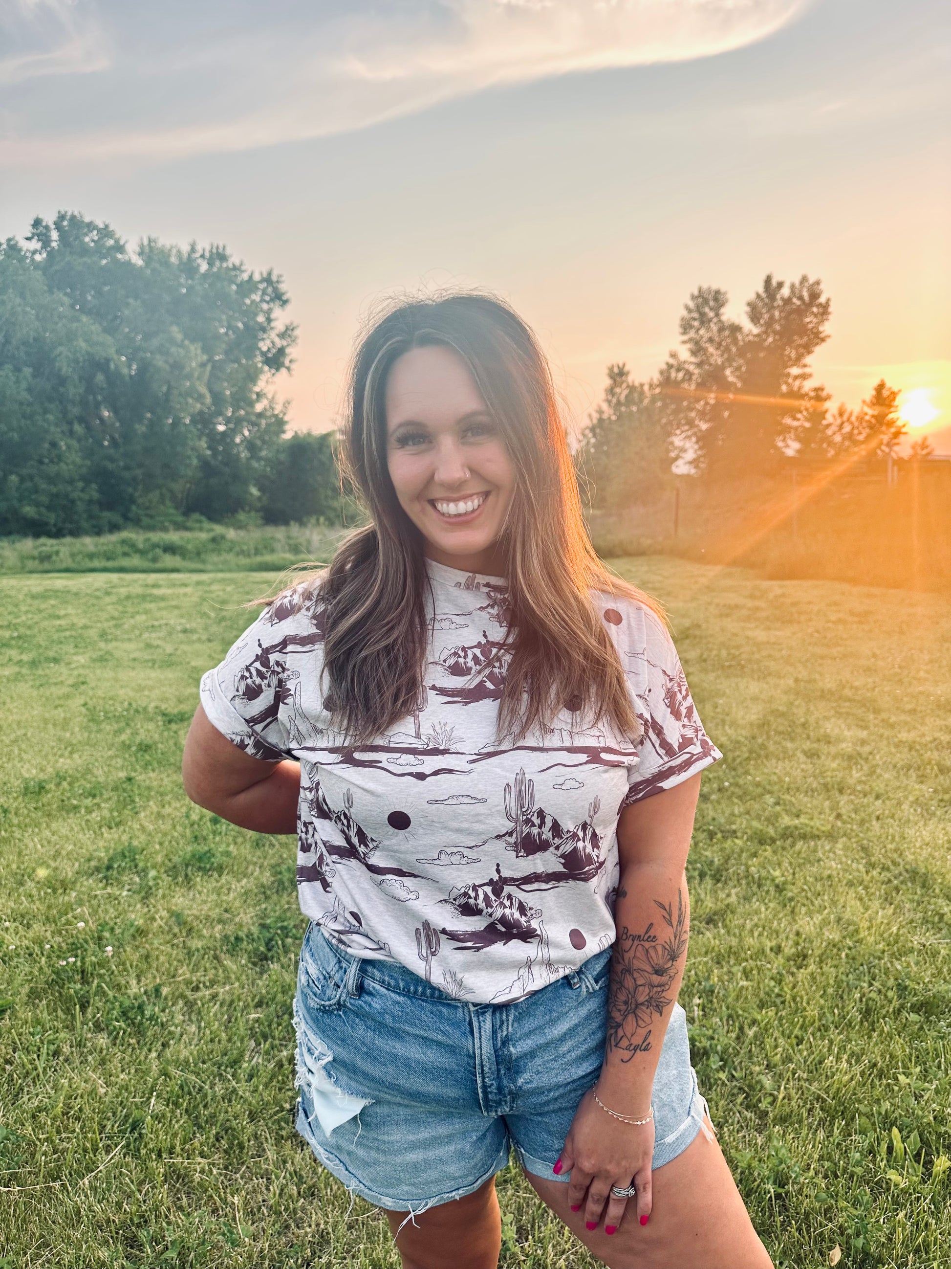 Saddle up in style with our Western Pattern Crew Neck Top! Featuring a bold, desert-inspired print with warm, earthy tones, this comfy tee is the perfect mix of rugged charm and casual cool. The relaxed fit and soft, breathable fabric make it easy to pair with denim, boots, or your favorite cutoffs. Whether you're headed to a country concert or just love that western flair, this top is a must-have for your wardrobe.